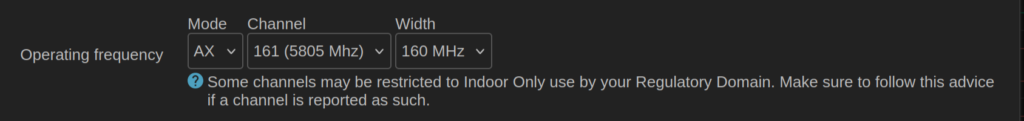 - For the sake of this tutorial, we will set the WiFi card up in AX mode using Channel 161 and a width of 160MHz
