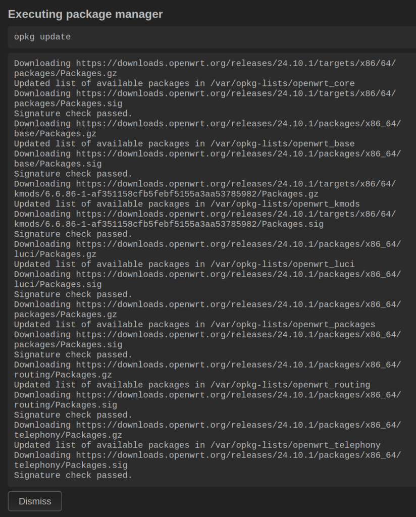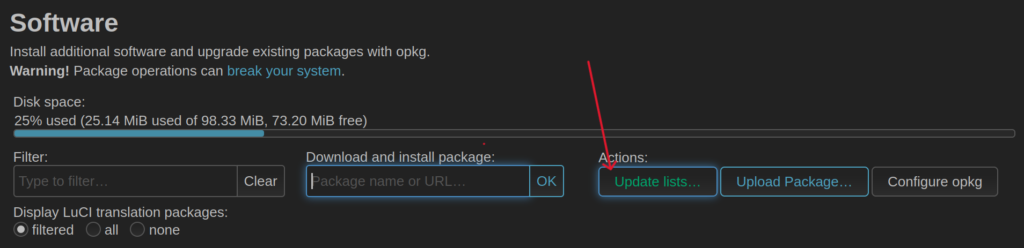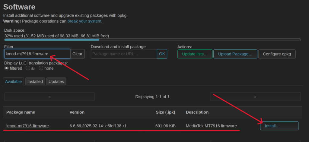 - Clear the "Filter" box then search for kmod-mt7916-firmware, and hit the "Install…" button