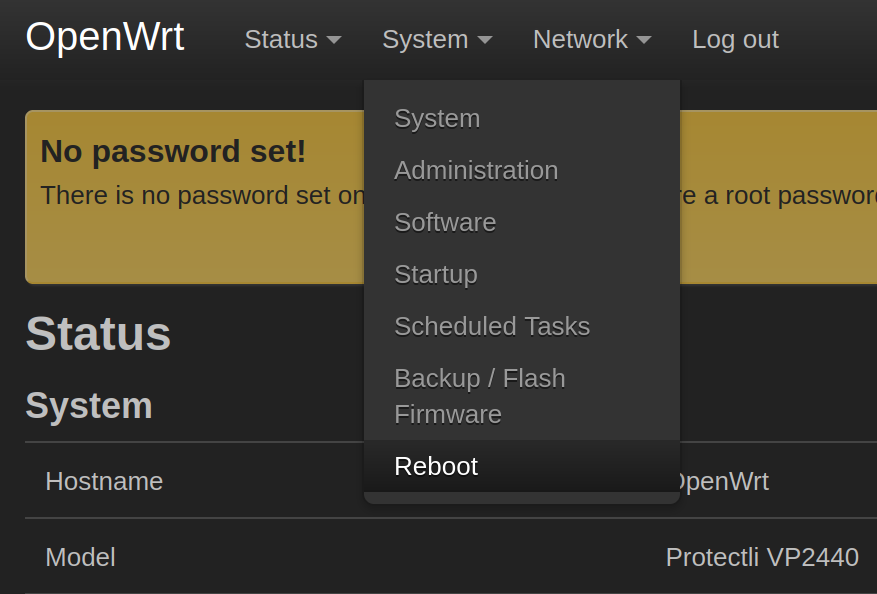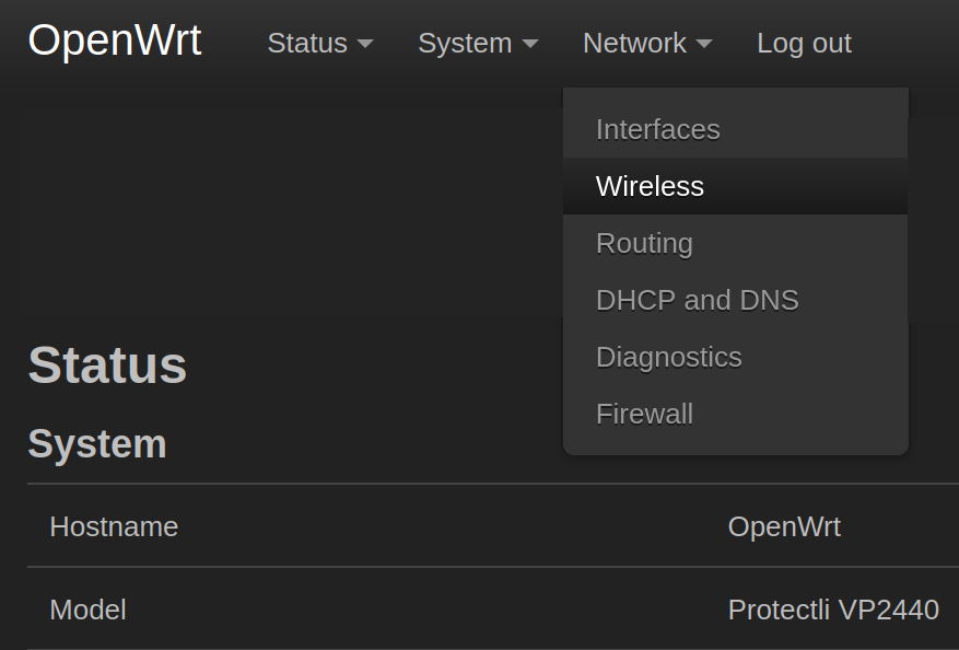 You will need a VP2430/VP2440 (or a non-Protectli Branded device) using the Mediatek WiFi 6E card. This unit will need to have OpenWrt installed as well. Instructions for installing OpenWrt can be found here. Once OpenWrt is installed, you can access the OpenWrt WebGUI by connecting a computer or laptop to the Vault's LAN port and accessing the default LAN address (normally 192.168.1.1), which is where the configuration will be modified.